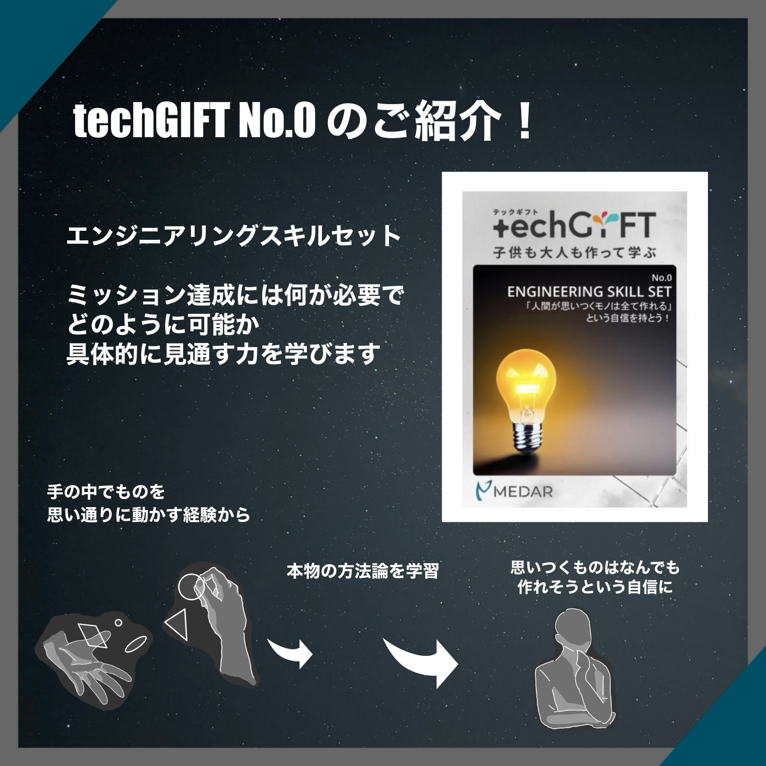 「techGIFT」にはNo.0とNo.1以降のモデルがありますが、それぞれで身につく力が異なっています。今回紹介するNo.0は、ものづくりと研究の方法論を実践的に学んでいく「ENGINEERING SKILL SET」です。宇宙開発などで使われる方法論を学び、電子工作やプログラミング、システムエンジニアリングを体験することで、「思いつくものはなんでも作れそうだ!」という自信を育んでいきます。