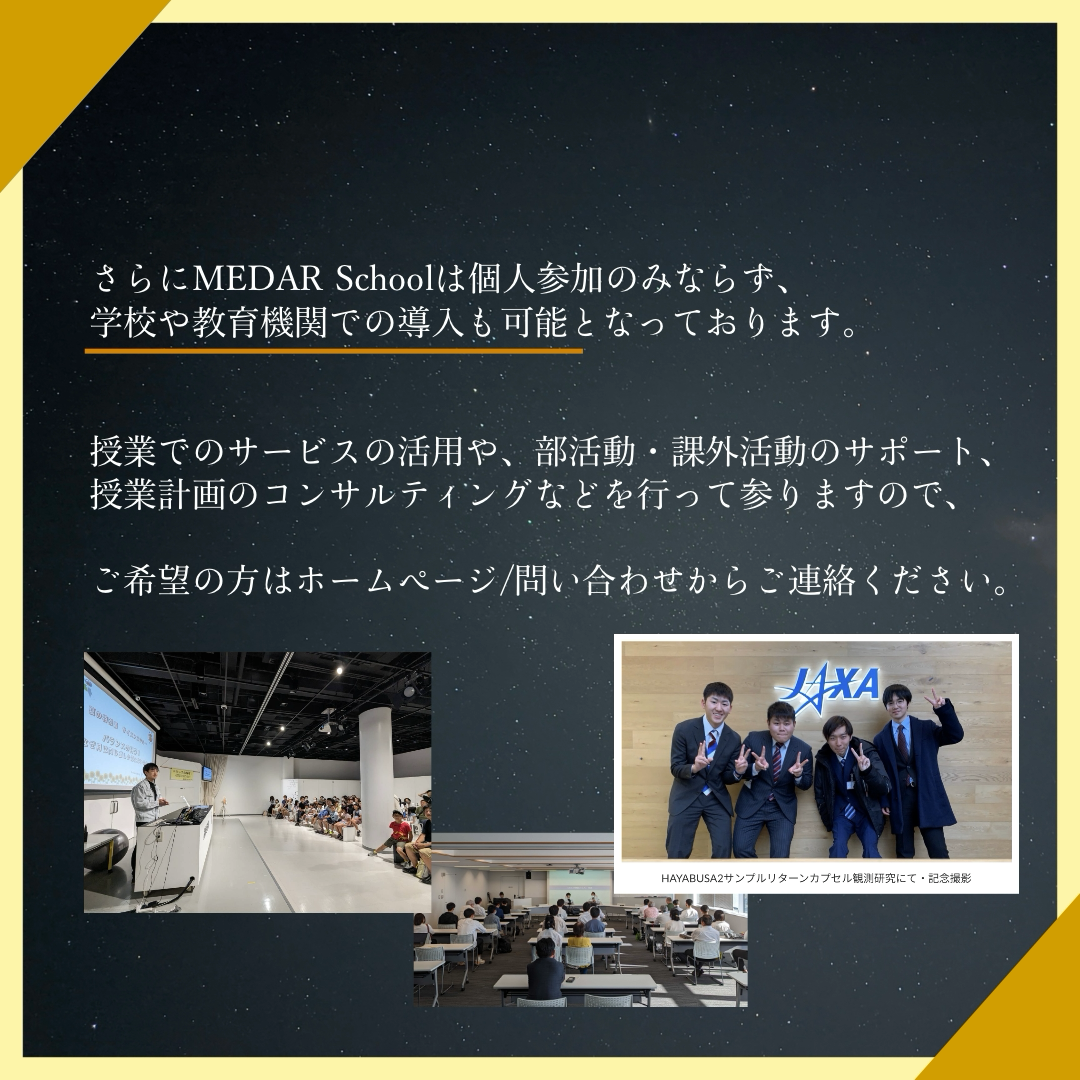 さらにMEDAR Schoolは個人参加のみならず、学校や教育機関での導入も可能となっております。授業でのサービスの活用や、部活動・課外活動のサポート、授業計画のコンサルティングなどを行って参りますので、ご希望の方はホームページ/問い合わせからご連絡ください。