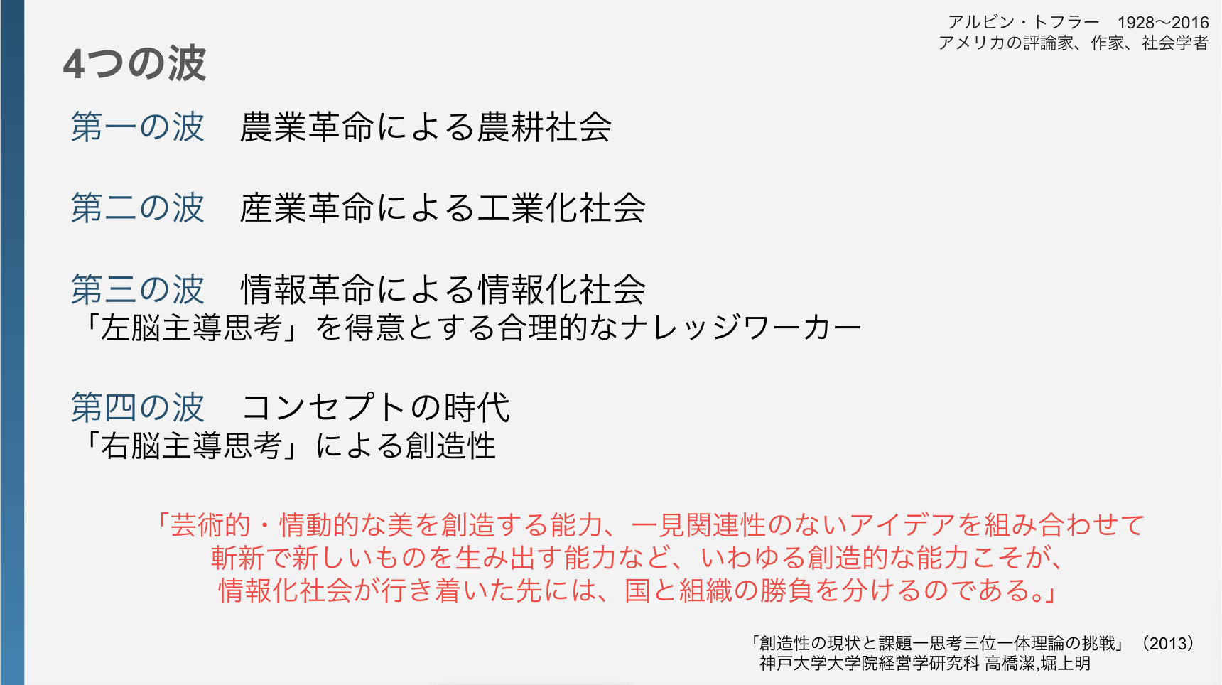 その視点を参考に、家庭に対する問題意識や、既存の学校制度に対する問題意識などをふまえ、創造性の教育について考えます。