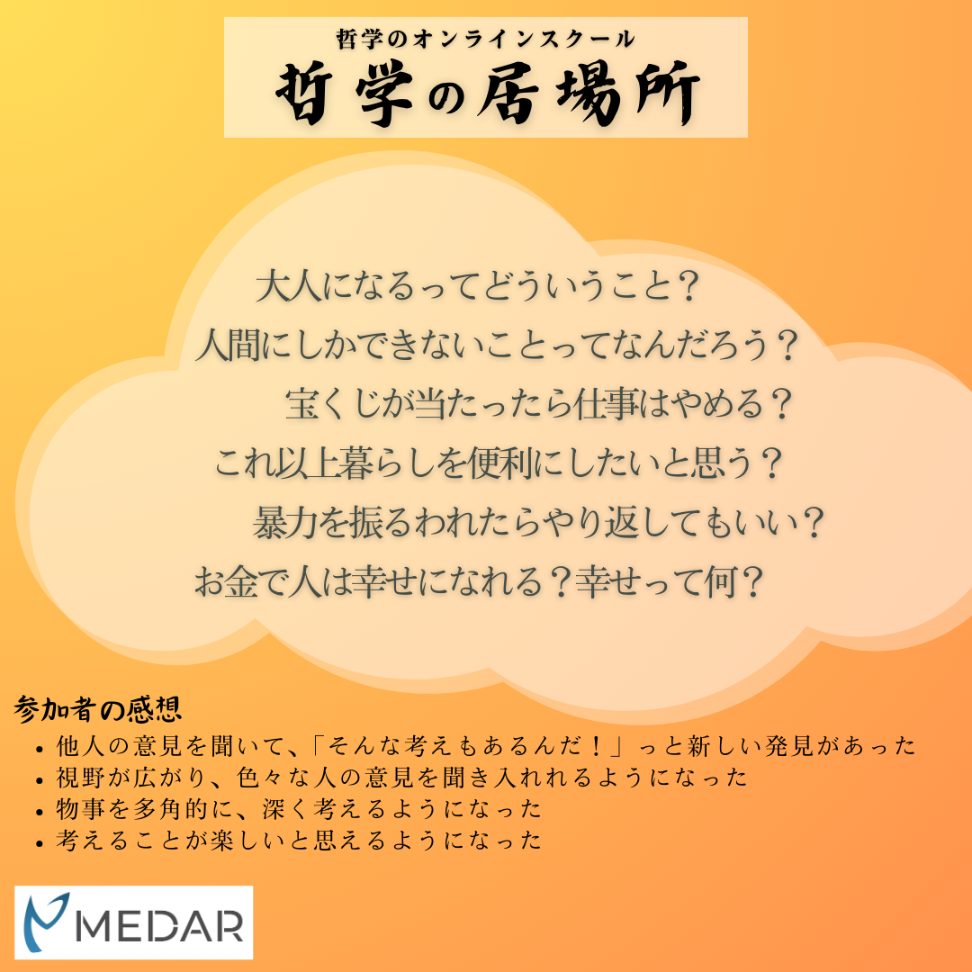 この度、理工系のオンラインアトリエ「MEDAR School」や、ロートこどもみらい財団様にて実施していた哲学講座を新サービス「哲学の居場所」としてスタートします。
