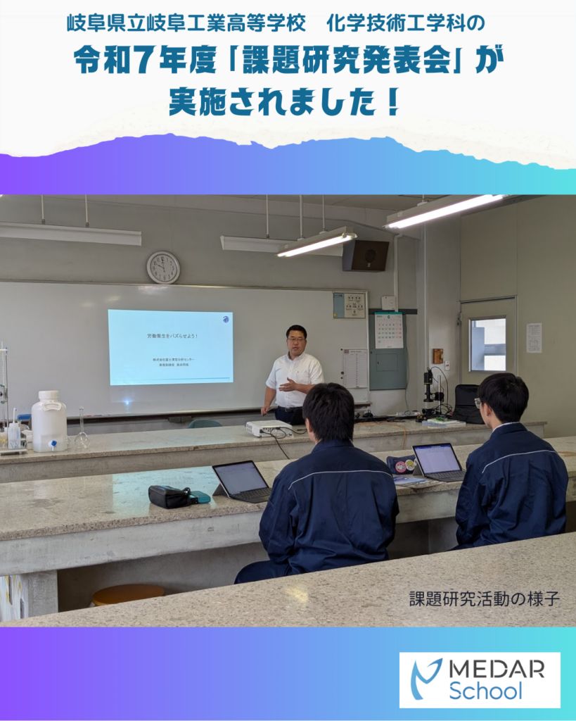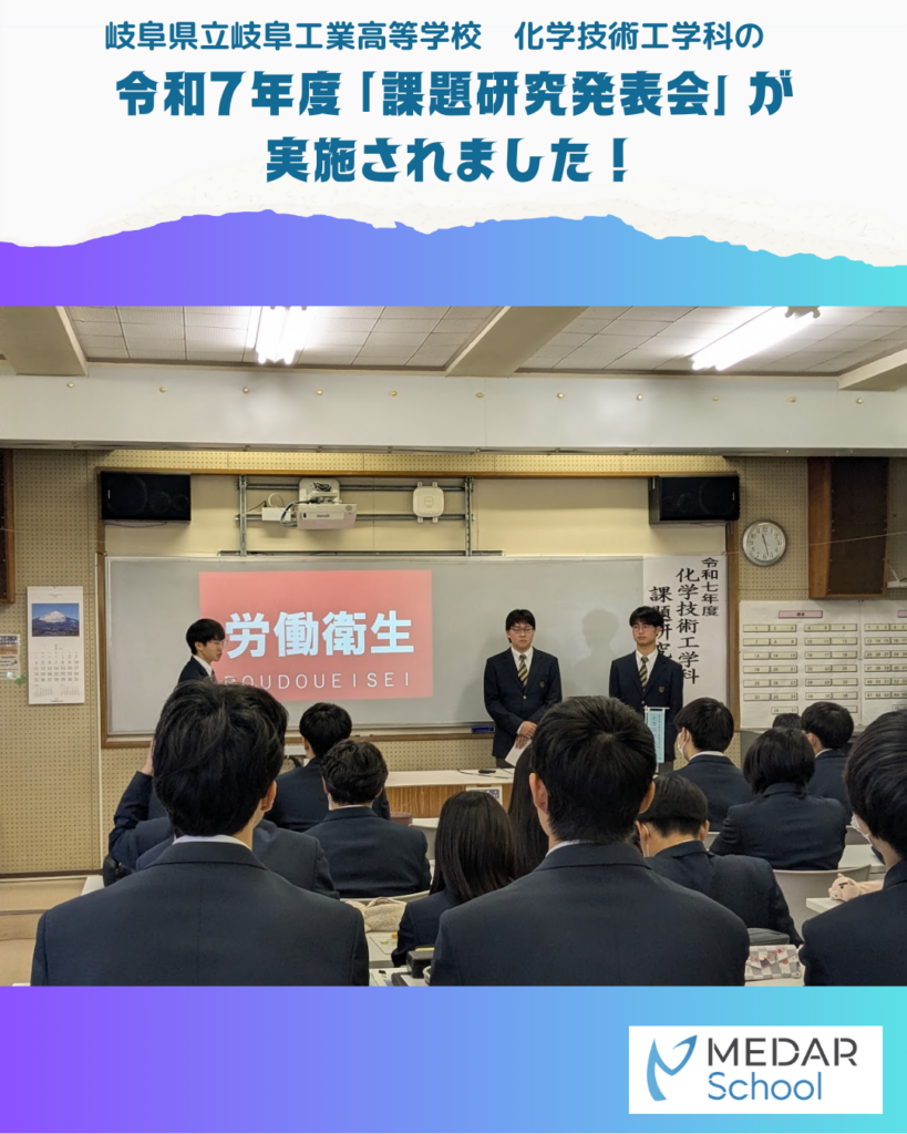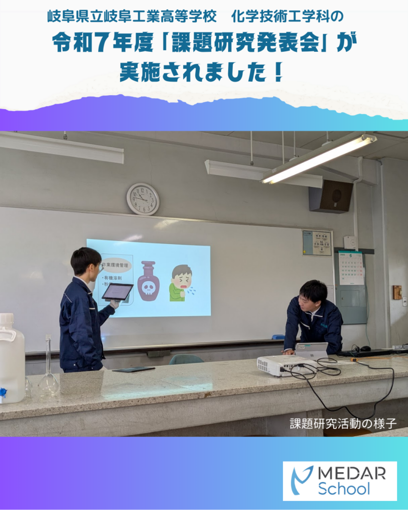 1月28日(水)、岐阜県立岐阜工業高等学校 化学技術工学科の課題研究発表会が実施され、富士清空分析センターの奥田将旭様、一般社団法人MEDARの川地皐平が来賓として参加させていただきました。